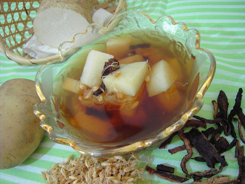 玉米須30克,豬苓10克,生薏苡仁30克,陳皮5克,黑豆50克,牛肉100克,生姜10克,大棗10枚,精鹽適量。將牛肉洗凈,切成小塊。全部用料一同放入砂鍋,加適量水,小火煮2小時,加精鹽調味即成。有清暑利濕、健脾益氣的功效。