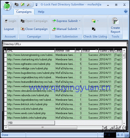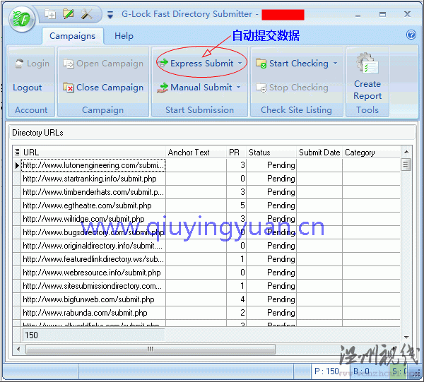 4、網站信息填寫完畢后,點擊“open campaign”,軟件就會向服務器申請數據,然后會返回150個Directory URLS列表。網站目錄列表讀取完畢后,你可以使用兩種方式進行提交,一種是自動提交數據(快速提交),一種是人工提交,建議使用“自動提交數據”,這種方式效率較高,成功率也不錯。