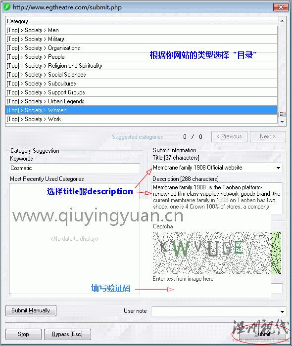6、點擊“submit”即完成一次提交,重復以上動作,即可完成所有網站目錄的提交工作,由于軟件是使用服務器端的實時更新數據,因此軟件提交的成功率很高,我自己提交了150個網站目錄,成功提交的有120個,失敗的只有30個,這里面還包括一些是因為驗證碼填寫錯誤導致的失敗網站,總的看來,這軟件的成功率是相當高的。