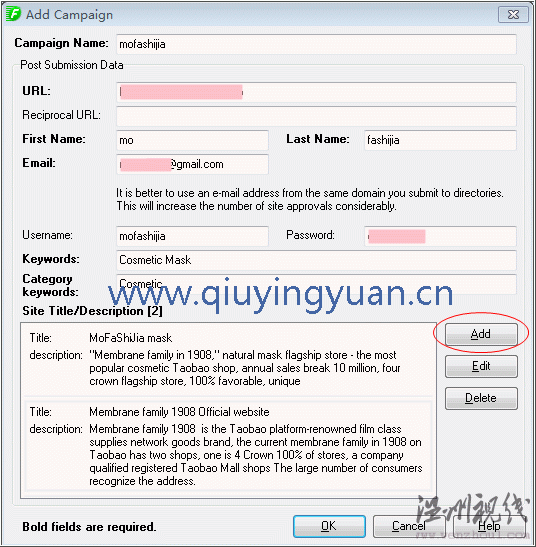 黑色粗體的選項是“必選項”需要認真填寫,site title/description填寫你網站的標題跟描述,點擊軟件中的“add”即可添加,軟件建議你填寫2個不同的title跟description以提高提交成功率。