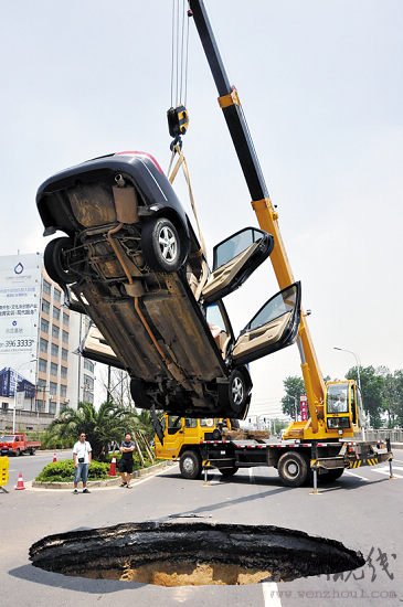 上周五,陷入南昌街頭塌陷路面上的小轎車(chē)被吊離現(xiàn)場(chǎng) 新華社 發(fā)