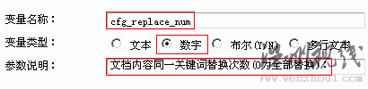 在后臺系統(tǒng)設(shè)置中 添加新變量 變量名為 cfg_replace_num 并且設(shè)置成你所希望的數(shù)字型數(shù)量。cfg_replace_num的解釋為:文檔內(nèi)容同一關(guān)鍵詞替換次數(shù)(0為全部替換):