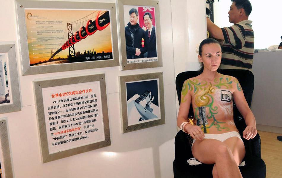 衛(wèi)浴展現(xiàn)場人體彩繪:5月25日,上海衛(wèi)浴展在新國際博覽中心舉行,外籍模特現(xiàn)場彩繪引路人圍觀。現(xiàn)在的商家好像正規(guī)的商業(yè)營銷都不會了,除了明星代言就是人體藝術(shù),或者干脆就是邀請?jiān)掝}女助陣。上海衛(wèi)浴展邀請孫儷,陸毅等明星站臺。還有請外籍女模特現(xiàn)場展示人體彩繪的,一樣吸引著路人的眼球,紛紛駐足觀看,還拿出手機(jī)拍照,怎么也解讀不懂衛(wèi)浴和人體藝術(shù)圖片有什么關(guān)聯(lián),這就是模特商業(yè)化的美女經(jīng)濟(jì)?