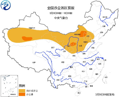 9日08時至9日20時,南疆盆地、甘肅中西部、內蒙古中西部、陜西中北部、寧夏、山西、河北中北部、京津等地有揚沙或浮塵天氣,其中,南疆盆地東部、內蒙古中西部局地有沙塵暴。