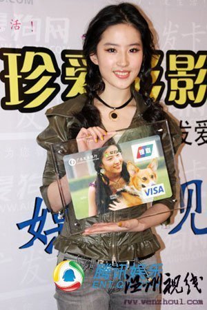 當天活動的主題是推廣一種最新推出的“廣發愛狗卡”,一向以愛狗出名的劉亦菲很開心地應邀出席,也成為該卡的第一位擁有者,還相當賣力地宣傳推廣這種新穎的信用卡。據了解,劉亦菲自己也養了兩只雪納瑞,這兩只寵物狗的名字分別為來福和Candy,最近還多了一位名為“寶寶”的新成員。